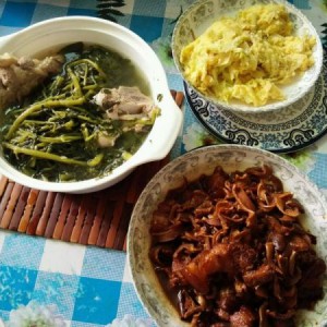 五花肉切块中火翻炒到两面金黄,放入姜蒜干辣椒再翻炒一会,倒入笋干翻炒一下。加入老抽 生抽 水(刚过肉面)。烧开后转小火30分钟。放点盐。ok了!刚上桌拍了个合照,转眼从厨房回来就没了一大半……所以没有了成品的特写啦哈哈