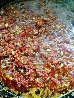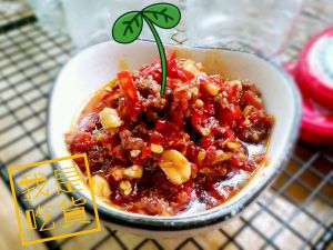 锅中倒入和辣椒一样多的油,待油7成热时,倒入辣椒翻炒,待汤汁收些时陆续加入牛肉末,盐,糖,虾粉,香菇末,蒜末,姜末,瑶柱碎,每倒入一样时翻炒几下再倒下一样,然后不停的翻炒,防止糊底