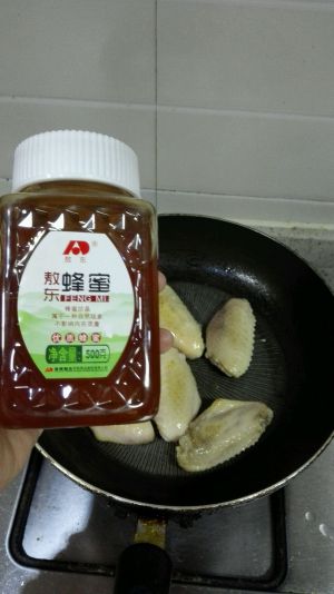 第二步:翅中微微略黄,即可放入蜂蜜。正面抹上蜂蜜,煎1分钟,翻面。