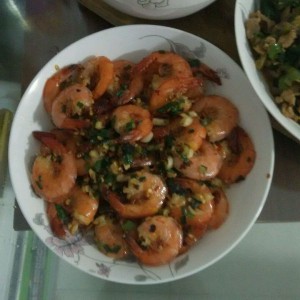 放虾炸黄,放凋味品,少量水,收汁,放葱起锅。