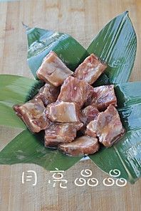 充分拌匀后,用棕叶垫底,把排骨铺在棕叶上。