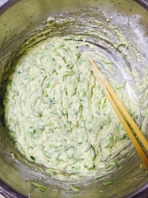 青萝卜洗净削皮擦丝,放盐揉搓萝卜丝,使萝卜丝变软挤出其中的水分,然后放清水洗一遍萝卜丝,挤干水分,然后用刀稍微切碎,把萝卜丝放入盆中,倒入鸡蛋液十三香和盐,加入面粉,也可以适当加入少量水,搅拌均匀,然后让面糊醒十分钟
