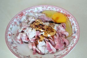 把肉倒入盘子里,加入一个鸡蛋,老抽3瓶盖,红薯淀粉。