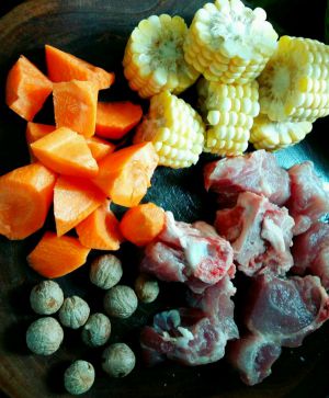 将红萝卜斜刀切开,玉米切开,龙骨焯水捞出来,海椰子敲掉壳,用刀轻扁碎。然后加入满满的水,煮开撇掉浮沫。中小火煮两个小时。