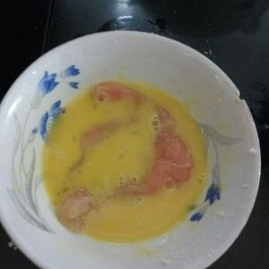 将腌制好的肉片放入打好的鸡蛋液中,两面均匀浸泡