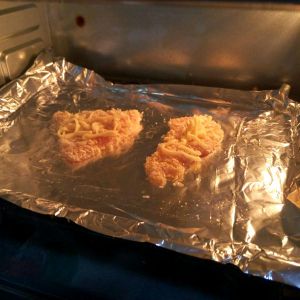 把撒上芝士奶酪的肉片放入烤盘,如果想做爆浆的,就把两块肉像汉堡一样叠在一起如果是一片烤的话,注意奶酪最后5到8分钟再放,不然容易糊。烤猪排时,上下管180度,15到20分钟。