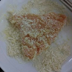 放入盛有面包糠的盘子里,两面裹好面包糠