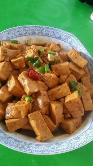 锅里放油,油热放姜和辣椒爆香,放入豆腐,放入料汁,大火烧开,小火焖煮五分钟,大火收汁,撒上香葱,出锅!