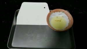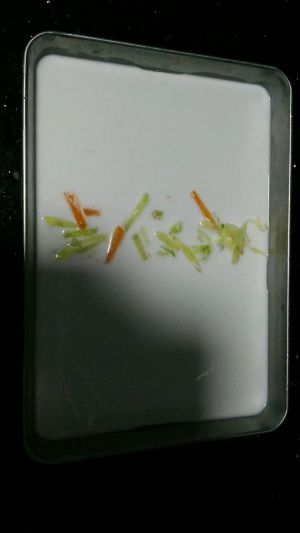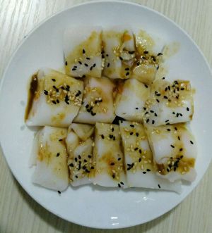 水和粉的比例,1:2.5,200克粉加500克水,搅拌均匀。在碟中倒入少许花生油,用刮板涂匀碟底,用汤勺舀粉浆倒入方形碟,摇一摇,让粉浆平铺碟底,加入少量青瓜丝,红萝卜丝。开水下锅放平碟,盖锅蒸4分钟左右即可。