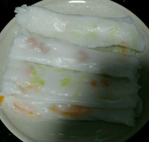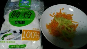 材料包括肠粉专用粉,红萝卜丝,青瓜丝。