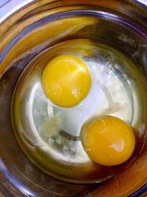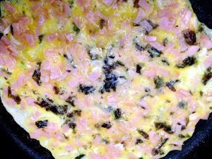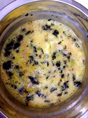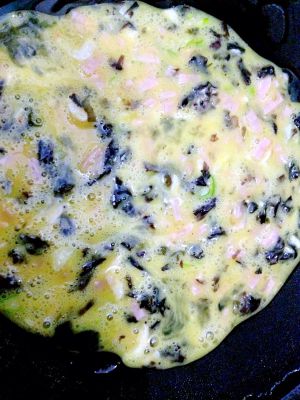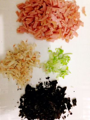 将火腿,虾皮,紫菜,小葱放入鸡蛋内打匀(因放了虾皮,可不放盐,如果口味重的可适量加一点点盐)
