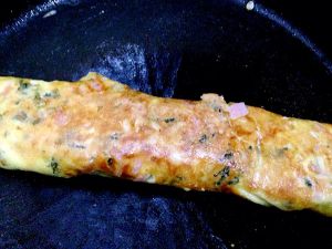 表面开始凝固时,将摊好的鸡蛋从一侧慢慢卷起