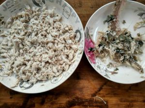 蒸熟的鱼,鱼汤倒出,葱姜捡出,鱼肉挑出鱼骨鱼刺,揭下鱼皮,顺势把肉弄烂