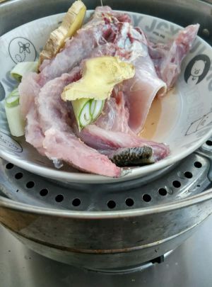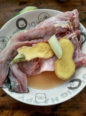 鱼身劈开倒进料酒,姜片,葱段腌制片刻