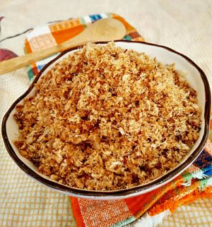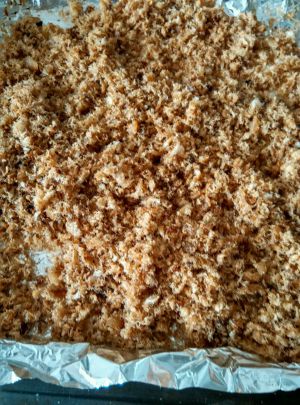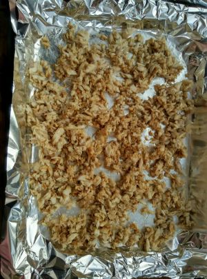 烤箱先120℃烤了65分钟,取出上下翻拌一下,再回烤箱转100℃烤30分,水分干了就行了,出来趁热撒上少许盐拌匀