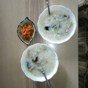 出锅前滴入一茶匙香油,放一点葱叶末,再放入姜丝,就可以出锅啦!(我老婆不喜欢吃姜,所以我是给老婆盛出后,放入姜丝的,一杯米,老婆喝了一碗,我自己造了三碗!2016第一天,小日子就这么开始啦!)