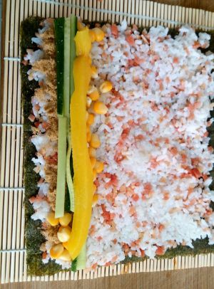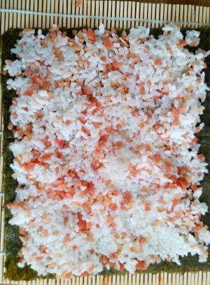 将准备的食材铺到卷帘上。(寿司工具网上都有卖的,很便宜,十几块钱全套)