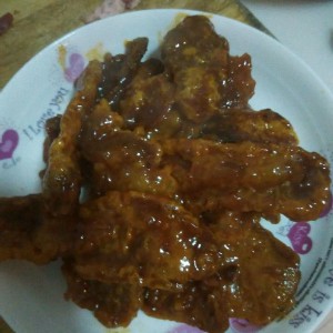 调汁时候忘记拍了,放番茄沙司,3勺左右,可以多一些,白糖2大勺,白醋两大勺放一点水,调和好,尝一下每个人口味不同,然后放锅里起大泡以后比较粘稠后把炸好了的肉放进去翻炒起锅……