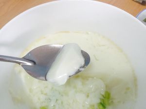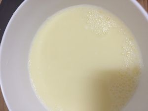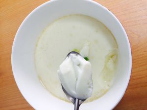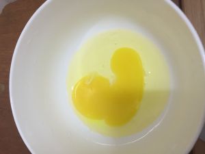 1个入碗。加入两倍多的温水。(热水变蛋花了,冷水蒸出来会有明显的难吃的蛋白,温水加入蛋白会溶解)加入水后同一方向搅拌。