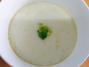 放适量盐,除去白色泡沫。加入两滴香油。(我滴多了,不过不影响味道)