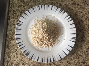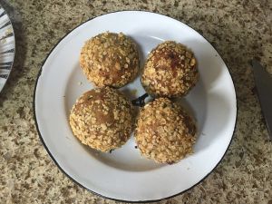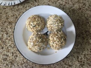 粘上燕麦片。其实应该用面包糠吗,但是我没有…只有之前做的抹茶面包可以是绿色的用来做面包糠怪怪的。