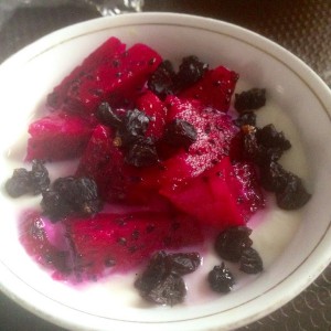 上锅蒸,15min,再在锅内静置10min。拿出来放上水果等…就可以吃了!