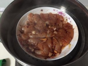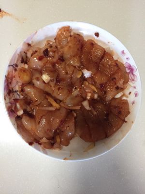 使葱,姜,料酒,豆瓣酱和肉混合均匀。覆盖保鲜膜,放入冰箱腌制一个小时一上。