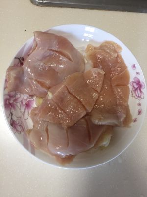 大葱切成小段,姜拍碎。鸡胸肉洗净,切成薄一点的几片,然后用刀在表面划几刀,用刀背拍打几分钟,使肉质更软。