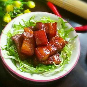 五花肉煸出油下葱、姜、蒜、辣椒八角,倒入料酒。