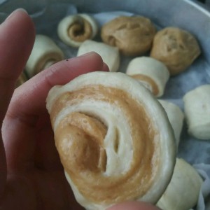 这是加了黑糖的面团用擀面杖擀成薄片,这里没有擀面杖我用整捆保鲜膜代替