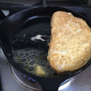 锅烧热,放入小块黄油,待黄油化了以后,放入蘸好蛋糊的馒头片,双面煎至金黄即可