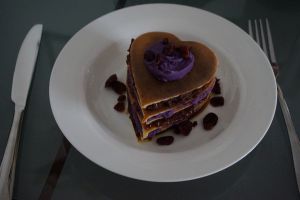一层松饼上涂一层紫薯酱,再铺一层涂上豆沙,再铺一层涂上奇亚籽覆盆子果酱,可以根据自己的喜好添加层数