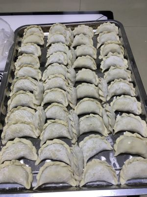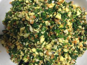 荠菜焯水一分钟,过凉水,握团把水挤干。(荠菜根不要去掉,好吃又有营养。)
