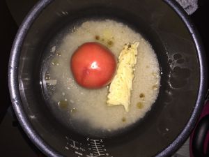 大米淘净,加入适量的水,食盐,黑椒,芝士,橄榄油。电饭煲设置到平时做米饭的模式就行。