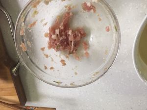 将香葱切末放入碗中,入肉糜、盐、生抽,顺时针搅拌成馅。
