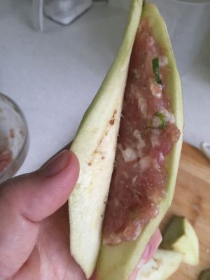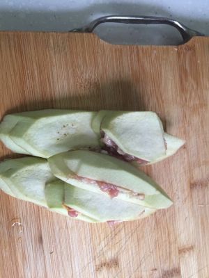 茄子斜切成片,每两片间留连接最好,将肉馅夹入两片茄子中,按平成茄盒。