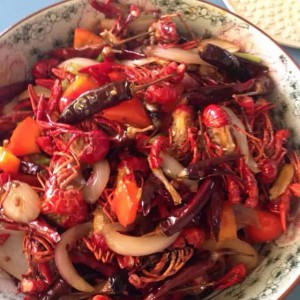 准备好一切配菜,油锅烧熟,一定要油多,烧熟后,关火,凉3分钟,倒入干辣椒,生姜蒜,开火炒香,然后倒入腌制的小龙虾,爆炒7、8分钟左右。