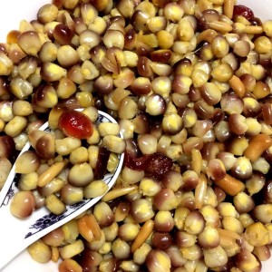 锅热放橄榄油,把松子玉米粒蔓越莓干爆炒,加入淀粉水和白糖