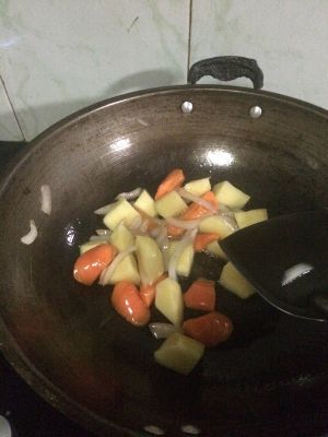 热油锅,加入洋葱,爆炒到香味出来。接着放入土豆,胡萝卜,继续炒一小会儿。