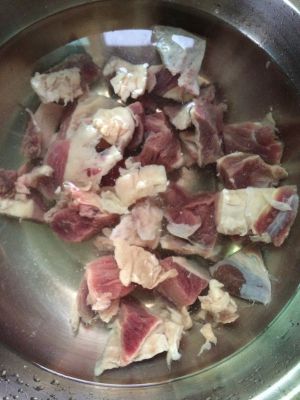 1。牛腩切成小块,在清水中浸泡15到20分钟。