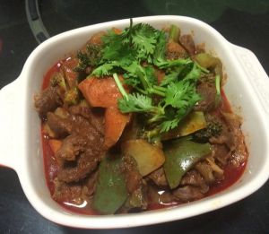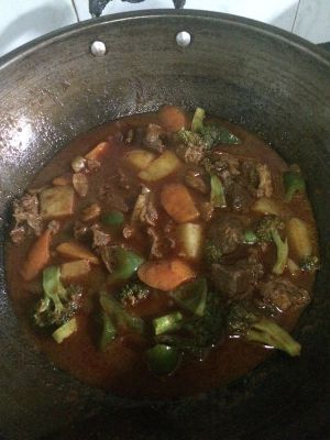 加入焯水的青椒,西兰花。加少许盐,糖,大火收汁。(自己根据自己的口味,和咖喱的味道添加)