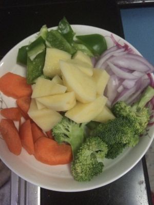 把洋葱切条。胡萝卜,土豆设成滚刀块。青椒,西兰花切小块