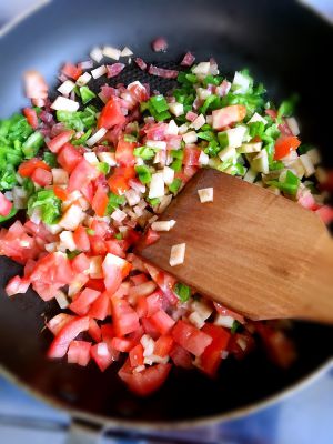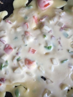 材料切成丁,面粉拌成糊,加适量盐和鸡精调味,把鸡蛋磕进去,拌匀