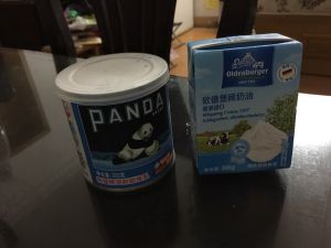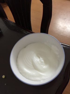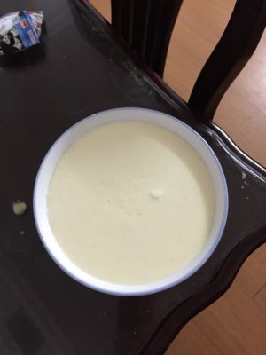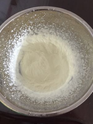 取冷冻的另一个容器还是冰水上,倒入淡奶油,用电动打蛋器打成糊状(打蛋器拎起来,奶油不会立刻滴下来的那种)