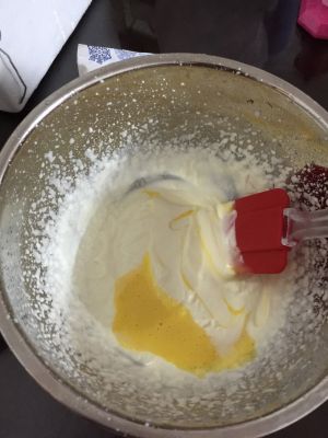 依次把蛋黄液、蛋清糊、炼乳均分3次倒入打好的淡奶油里(这里提个醒,淡奶油碗还是放在冰水上,这个分3次倒,一定要搅拌均匀后再倒下一次)