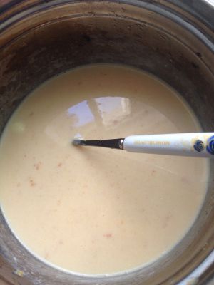 蛋黄、130克细砂糖、牛奶全部倒入奶锅,并搅拌均匀。把奶锅用小火加热并不断搅拌,直到液体受热后开始有沸腾的的趋势,立即离火!
