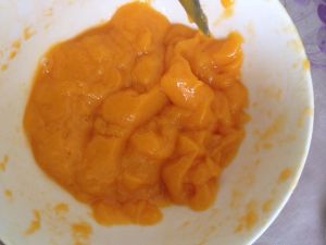 第三步的混合物彻底冷却后,将冷藏好的芒果泥倒入,并用打蛋器搅打均匀!