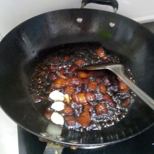 之后,加料酒,老抽等佐料,翻炒后加水煮