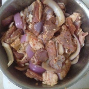 接下来放料酒(适量),只要抓匀后每块羊排都能抹到而且盆里还不会有剩余就是最完美的^_^
