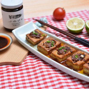 豆腐切长5厘米,宽3厘米,厚3厘米的长方块,在中间挖个小洞。将猪肉馅中,放入葱、姜、蒜碎末,1勺爱做的料、盐,调匀并,腌制15分钟。
